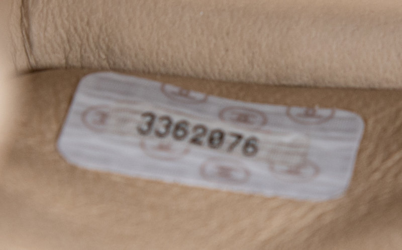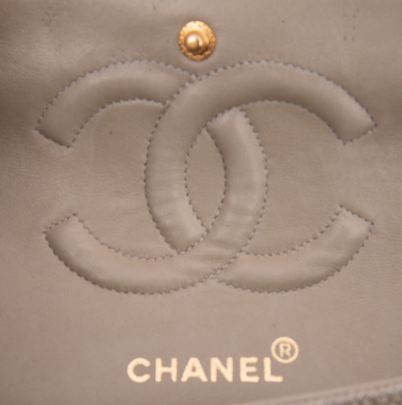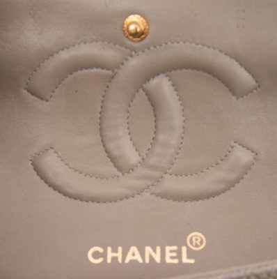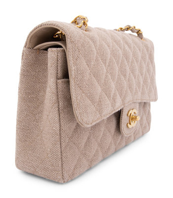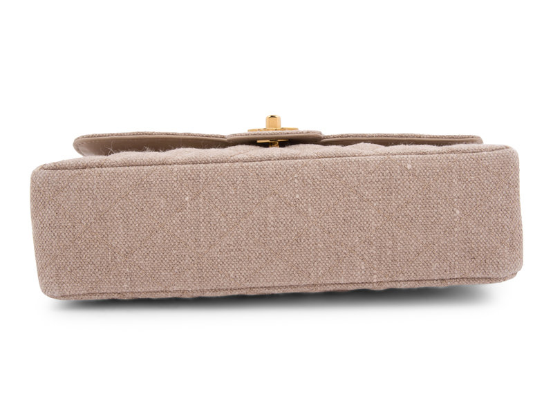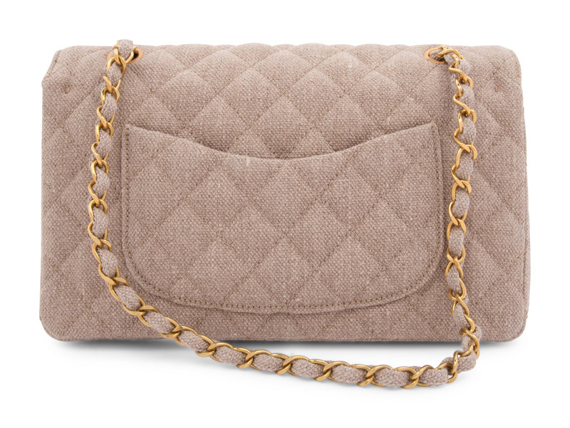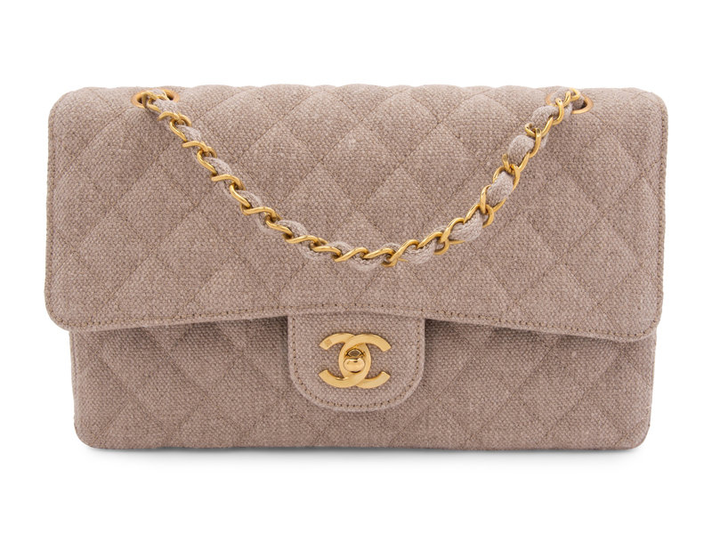 Beige quilted canvas medium double flap bag lined in beige leather with gold-tone chain and braided canvas adjustable handles, and front gold-tone CC turn lock closure.