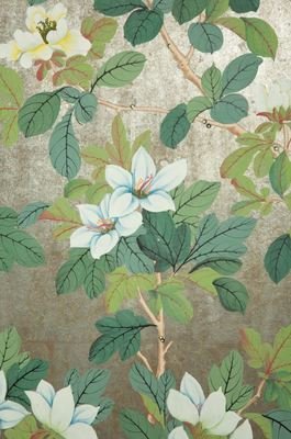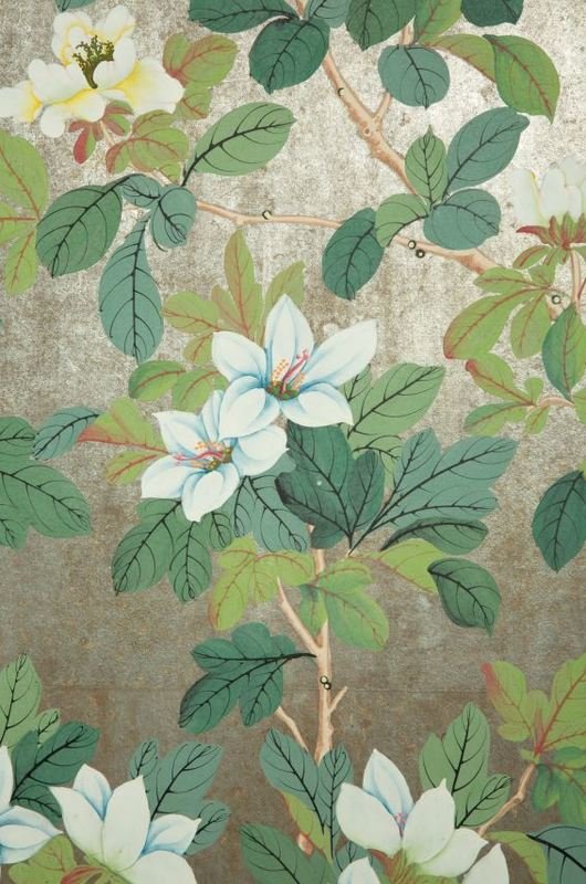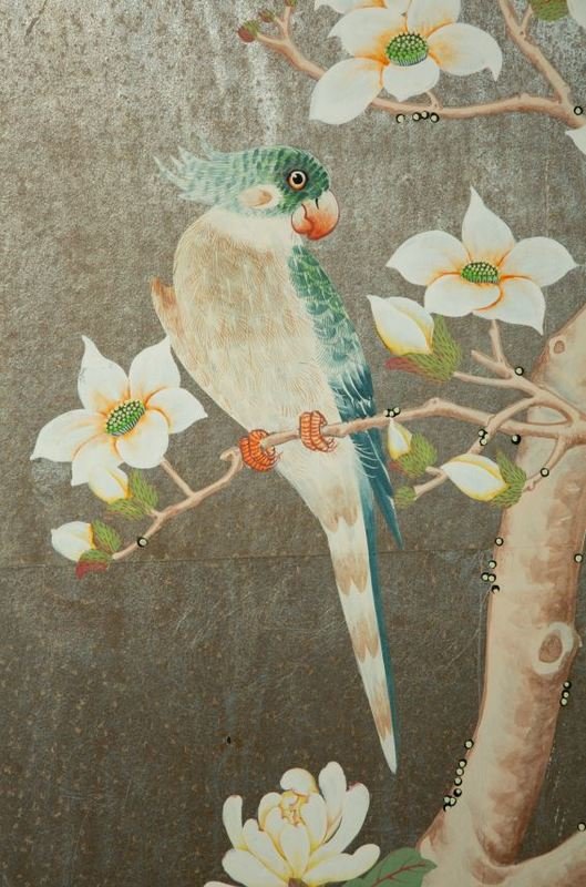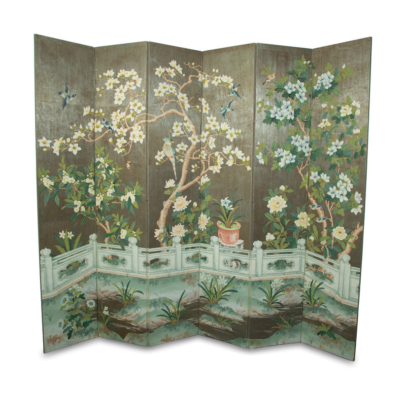 A Hand-Painted Six-Panel Gracie Screen Depicting a Chinoiserie Scene on Silvered Ground
