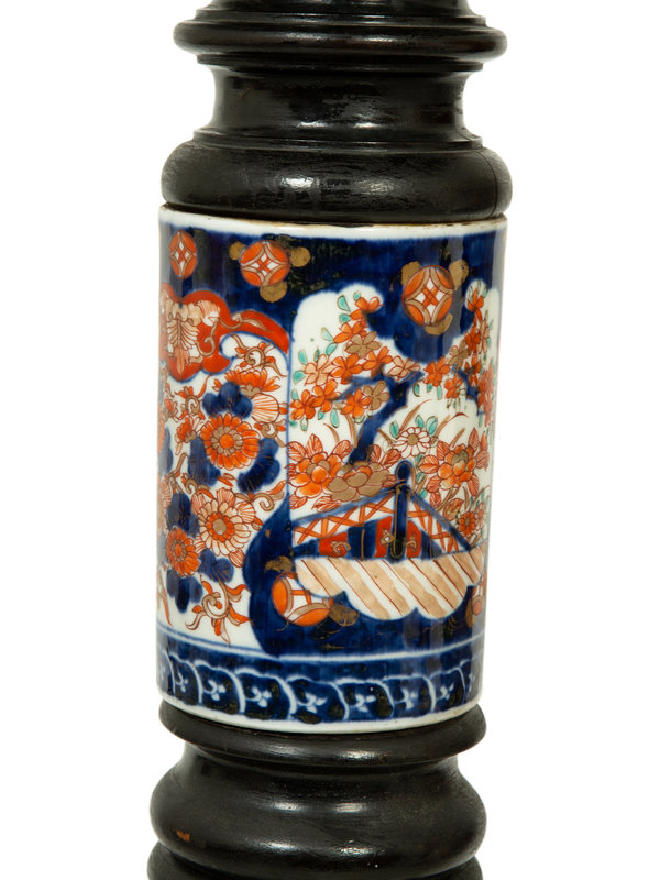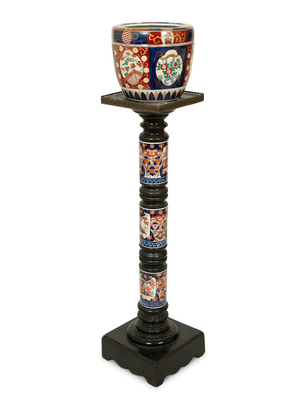 An Imari Porcelain Jardiniere on an Ebonized Pedestal with Imari Porcelain Mounts