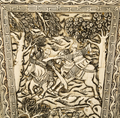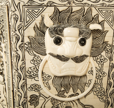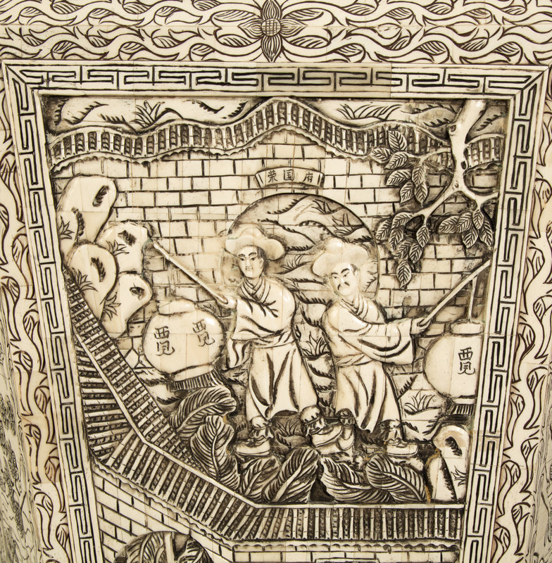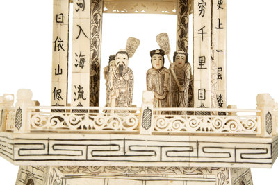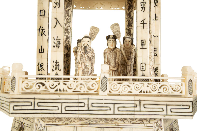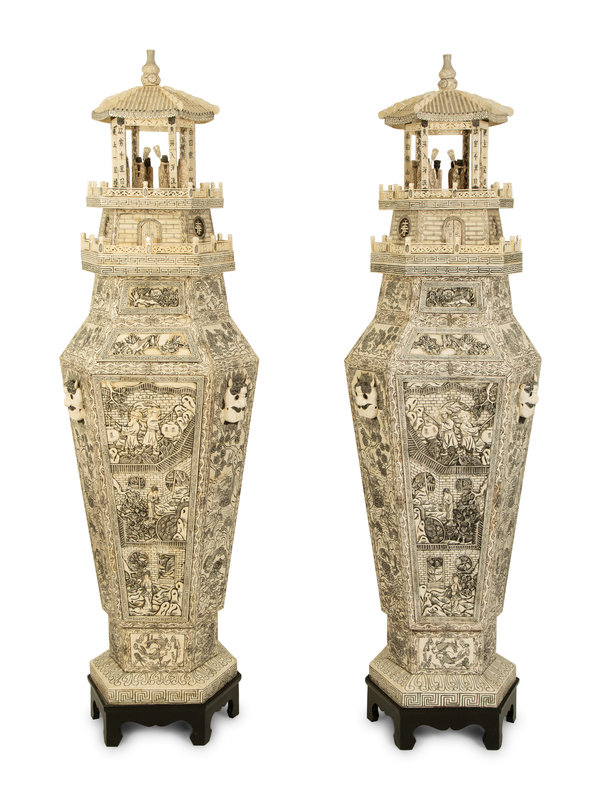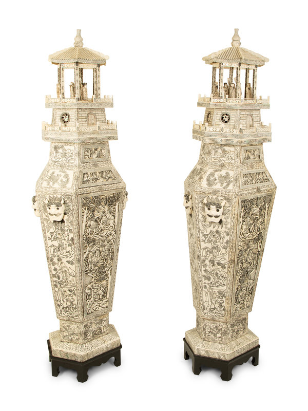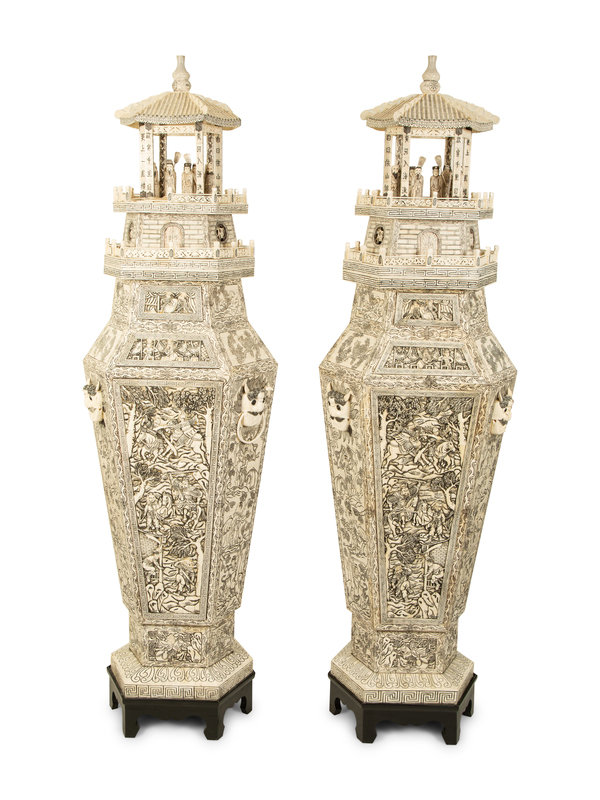 A Pair of Chinese Monumental Carved Bone Palace Vases with Pagoda Tops