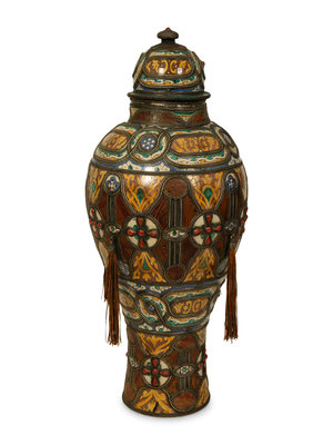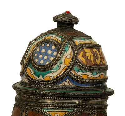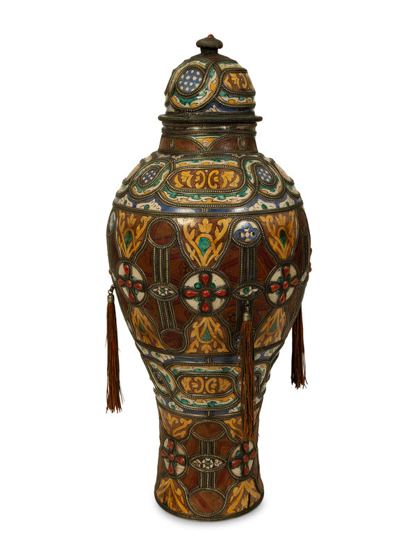 A Large Moroccan Silvered Metal and Hardstone Mounted Ceramic Urn