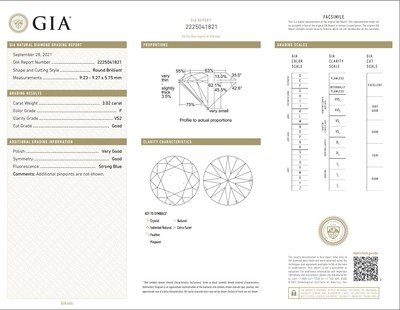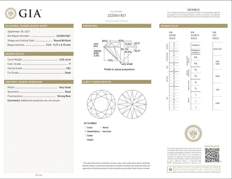 GIA, 2021, Report No. 2225041821, 3.02 carats, F color, VS2 clarity, Strong blue fluorescence