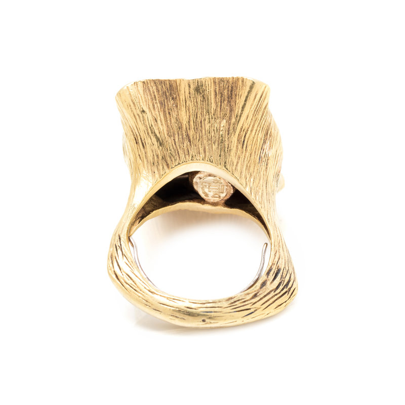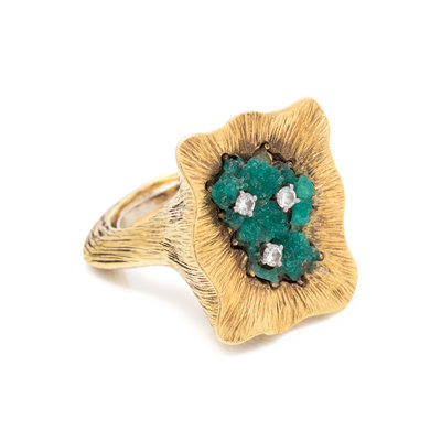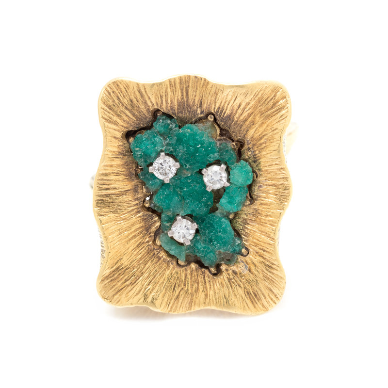 Consisting of a textured fluted form, the center containing a rough emerald crystal and three round brilliant cut diamonds weighing approximately 0.25 carat total. Ring size 9.