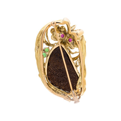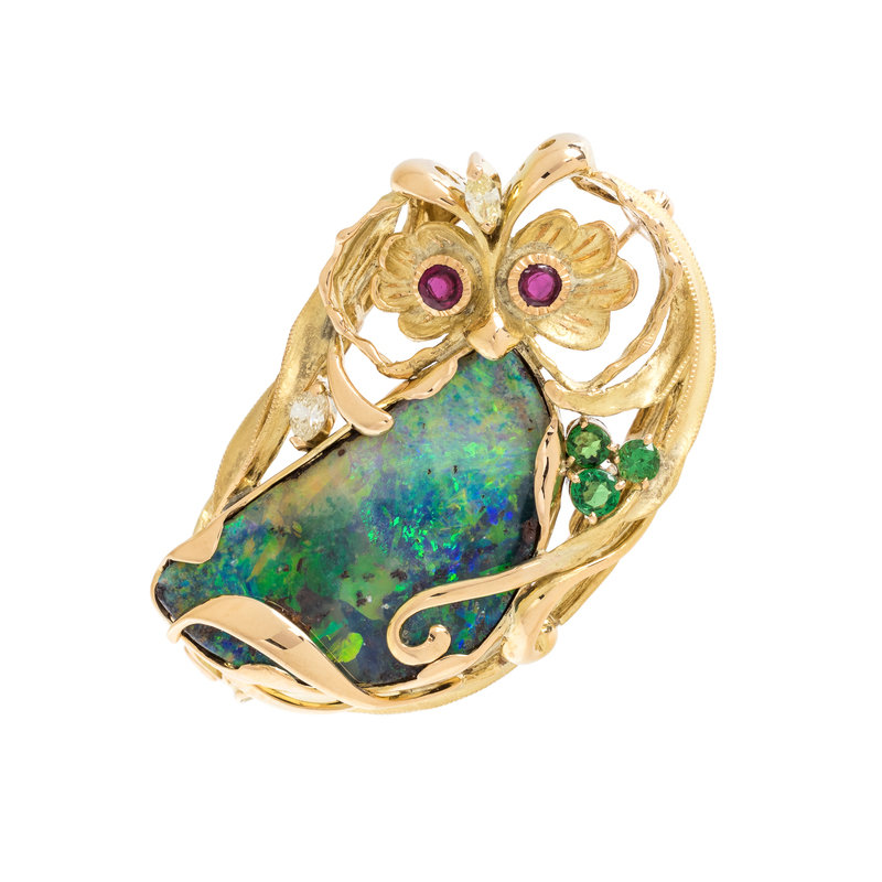 YELLOW GOLD, BOULDER OPAL, GEMSTONE AND DIAMOND OWL BROOCH