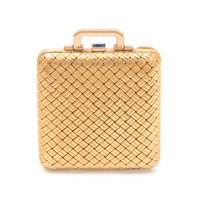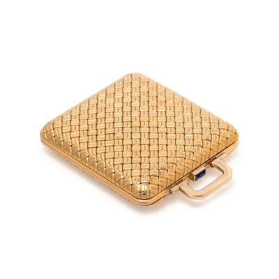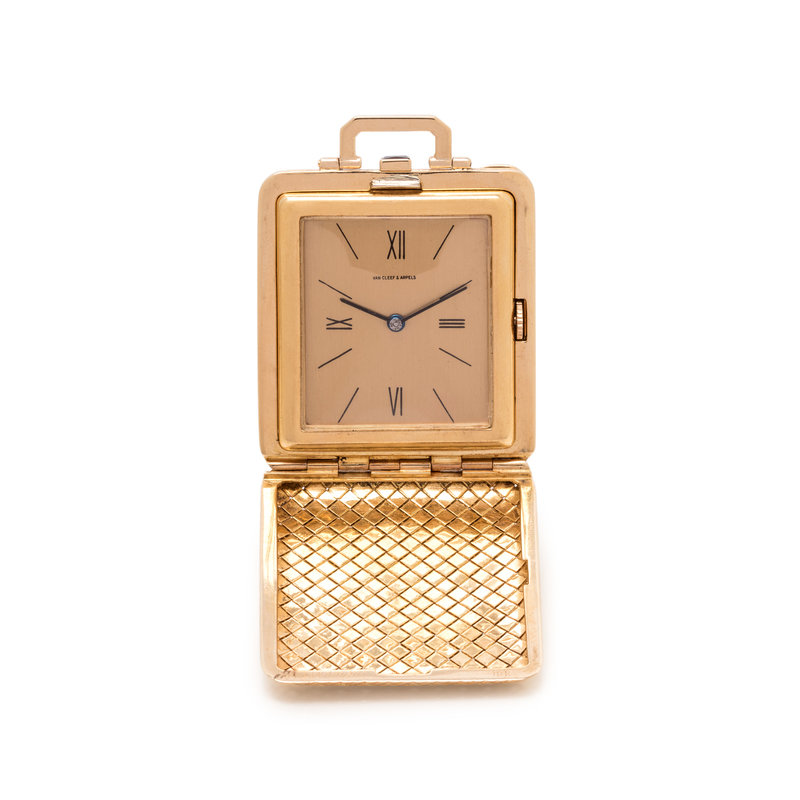 Consisting of a textured gold hinged case, the clasp containing one rectangular French cut sapphire, the interior watch with 36.00 x 33.00 mm case dimensions, matte gold dial signed VAN CLEEF & ARPELS, black Roman and baton numerals, 17 jewel manual wind movement signed ULYSSE NARDIN SWISS. 1 5/8 x 1 1/2 inches.