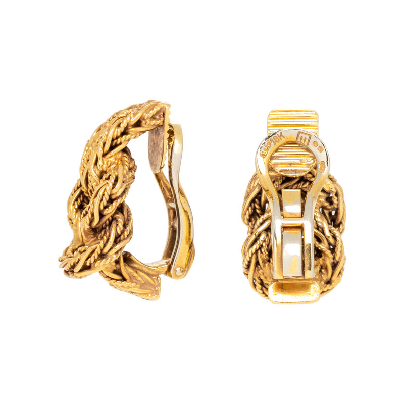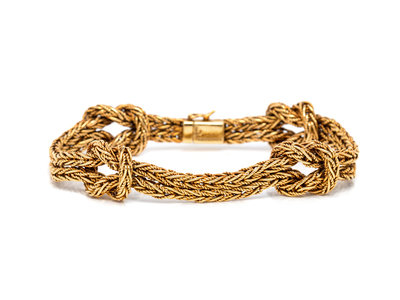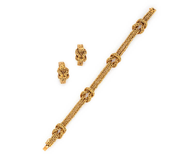 Consisting of a double strand foxtail chain bracelet with four Hercules knots, together with a pair of matching earclips. Bracelet: 7 1/4 inches long. Earclips: 7/8 inch long.