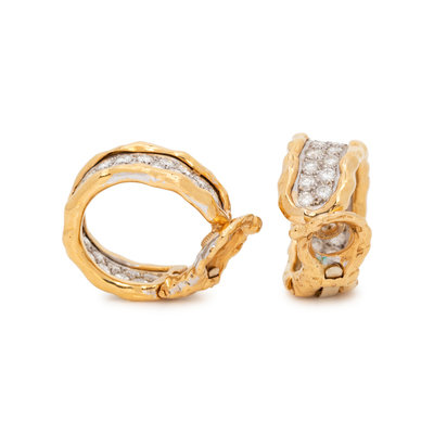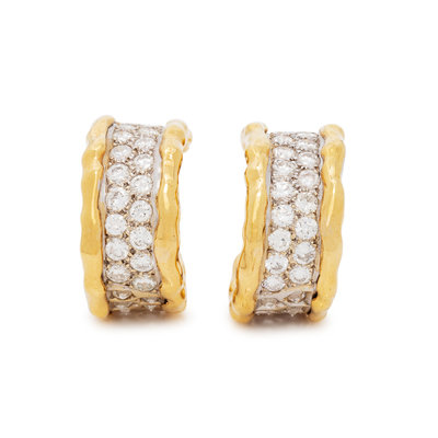 In an inside out style, containing 62 round brilliant cut diamonds weighing approximately 3.98 carats. Mounted in yellow gold and platinum. 1 inch long.