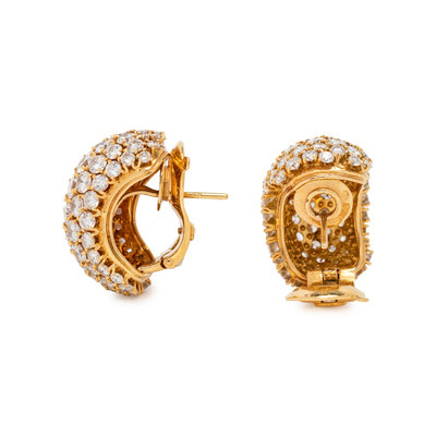 Containing numerous round brilliant cut diamonds weighing approximately 12.00-14.00 carats total, posts with clip backs. Mounted in yellow gold. 7/8 inch long.