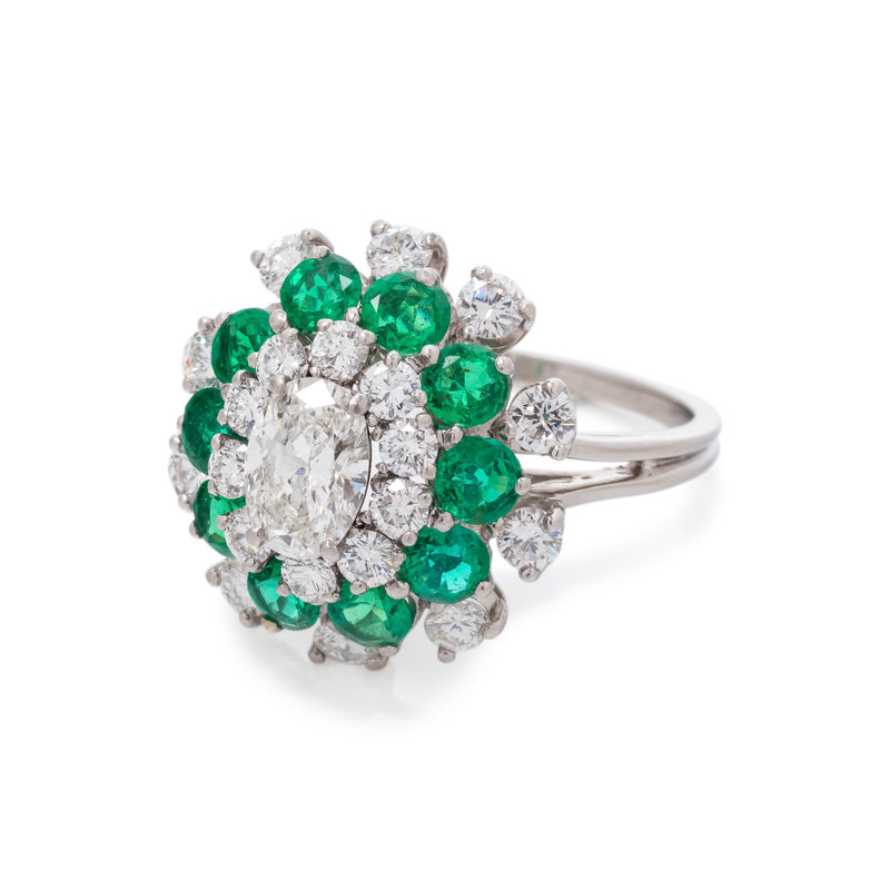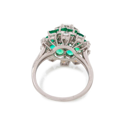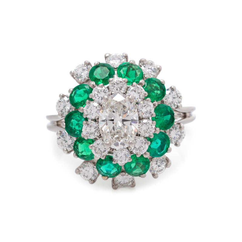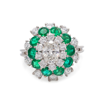 Containing one oval brilliant cut diamond weighing approximately 0.85 carat, 20 round brilliant cut diamonds weighing approximately 1.30 carats total and 10 round mixed cut emeralds. Mounted in platinum. Ring size 8.
