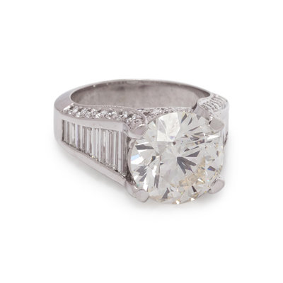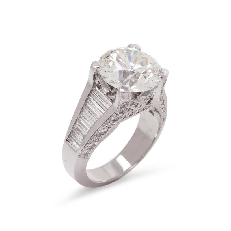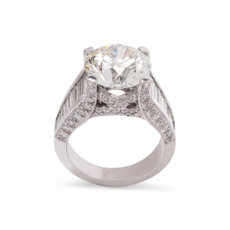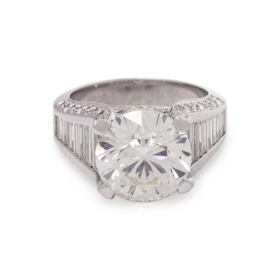 Containing one round brilliant cut diamond weighing 5.43 carats, 20 baguette and 52 round brilliant cut diamonds weighing approximately 2.50 carats total. Mounted in white gold. Ring size 6.