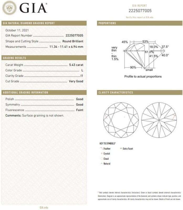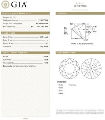 GIA, 2021, Report No. 2225077005, 5.43 carats, L color, I1 clarity, Faint fluorescence
