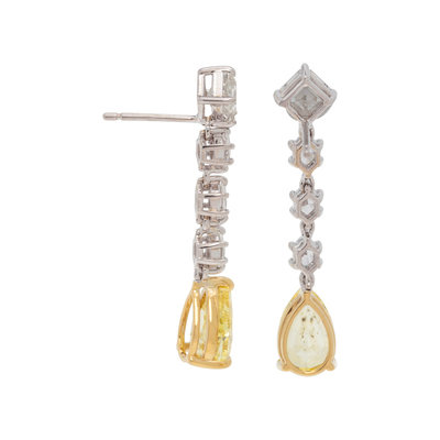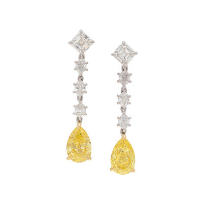 Containing one pear modified brilliant cut fancy intense yellow diamond weighing 2.32 carats, one pear modified brilliant cut fancy intense yellow diamond weighing 2.02 carats, six hexagonal brilliant and two square step cut diamonds weighing approximately 2.20 carats total. Mounted in bicolor gold. 1 3/8 inches long.