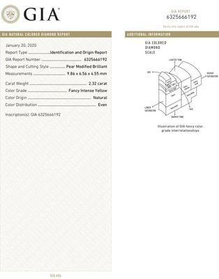 GIA, 2020, Report No. 6325666192, 2.32 carats, Natural Fancy Intense Yellow color