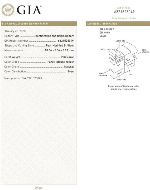GIA, 2020, Report No. 6321525049, 2.02 carats, Natural Fancy Intense Yellow color