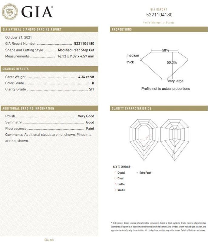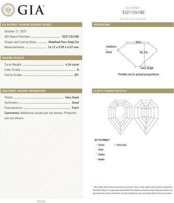 GIA, 2021, Report No. 5221104180, 4.34 carats, K color, SI1 clarity, Faint blue fluorescence