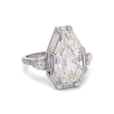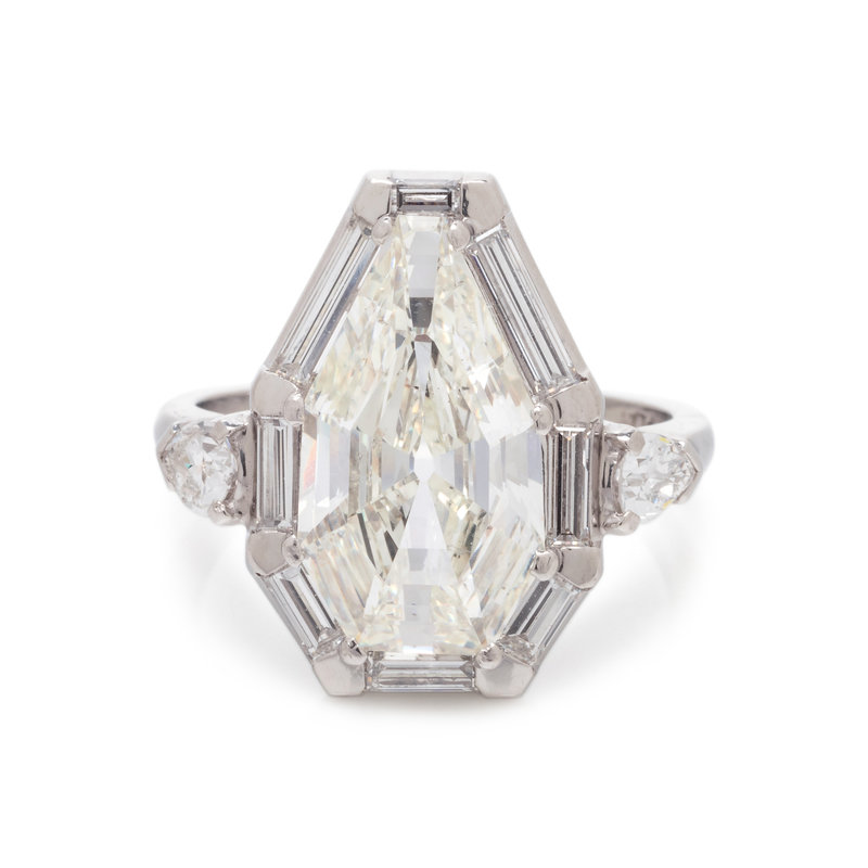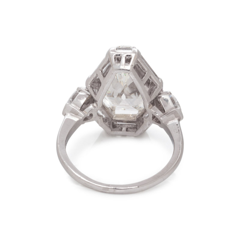 Containing one modified pear step cut diamond weighing 4.34 carats, eight baguette cut diamonds weighing approximately 1.45 carats total and two pear shaped diamonds weighing approximately 0.45 carat total. Mounted in platinum. Ring size 6 1/4.