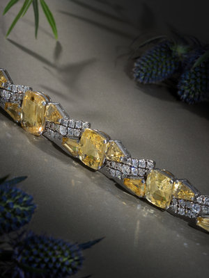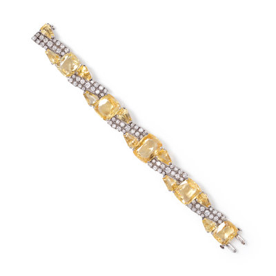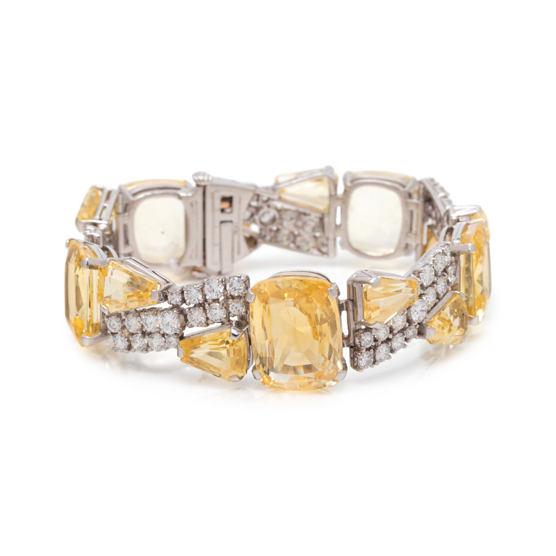 Containing five cushion mixed cut yellow sapphires measuring approximately 16.80 x 12.95 x 6.63 mm to 13.45 x 12.00 x 6.42 mm, 10 calf head cut yellow sapphires measuring approximately 9.35 x 7.40 mm and 75 round brilliant cut diamonds weighing approximately 5.00 carats total. Mounted in platinum. 6 3/4 inches long.