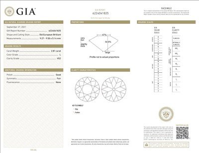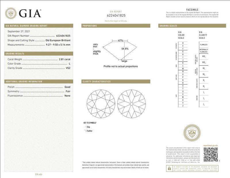 GIA, 2021, Report No. 6224041825, 2.81 carats, L color, VS2 clarity, No fluorescence