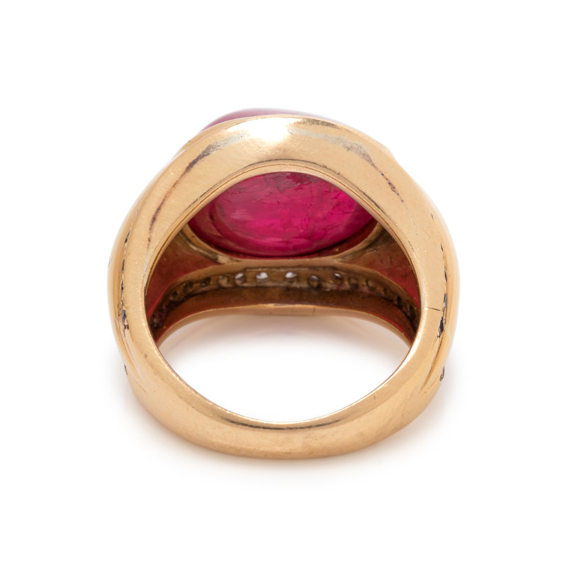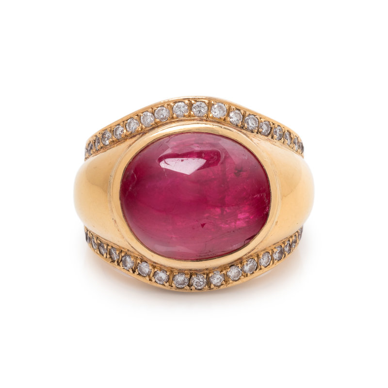 Containing one oval cabochon ruby measuring approximately 14.10 x 11.80 x 7.90 mm and 46 round brilliant cut diamonds weighing approximately 0.60 carat total. Ring size 5.