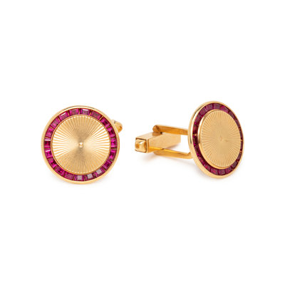 Consisting of round ridged cufflinks containing numerous calibre cut rubies. 3/4 inch diameter.