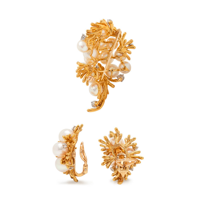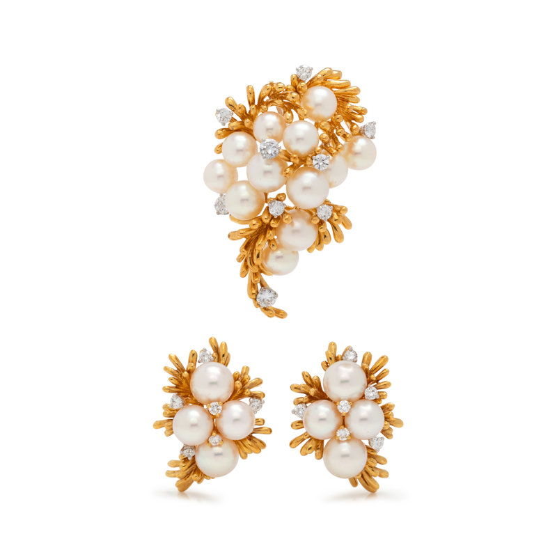 Consisting of a brooch containing 12 pearls and nine round brilliant cut diamonds weighing approximately 1.25 carats total, together with a pair of earclips containing eight pearls and 14 round brilliant cut diamonds weighing approximately 0.85 carat total. Brooch: 1 1/4 x 2 inches. Earclips: 1 1/4 inches long.