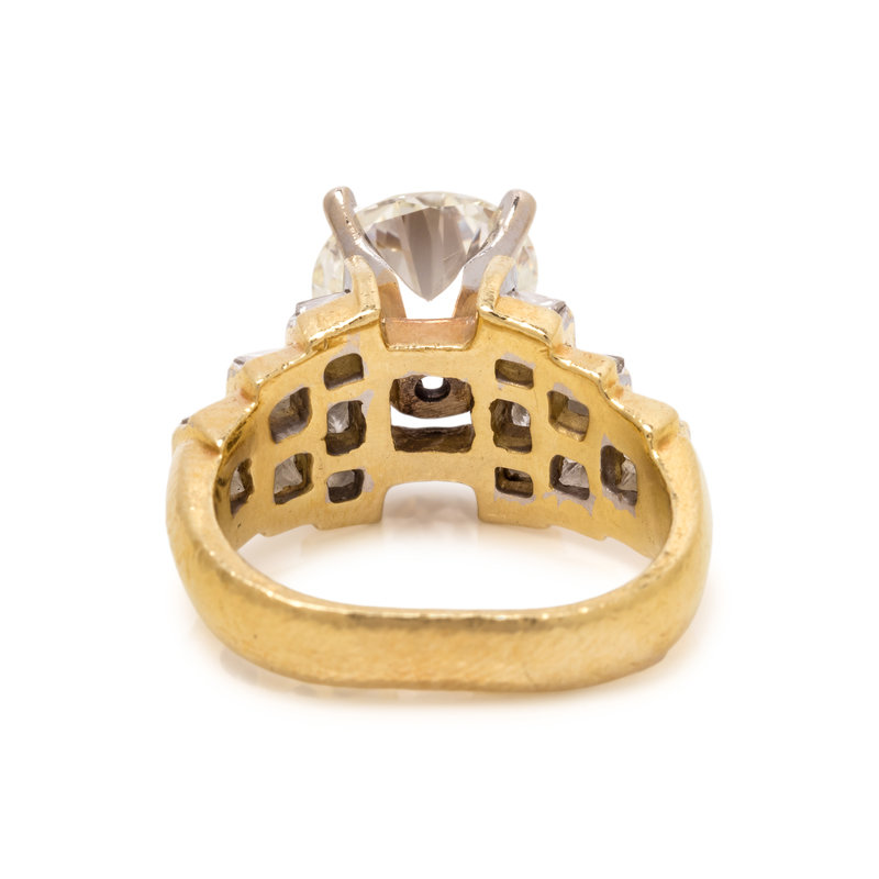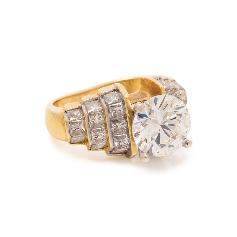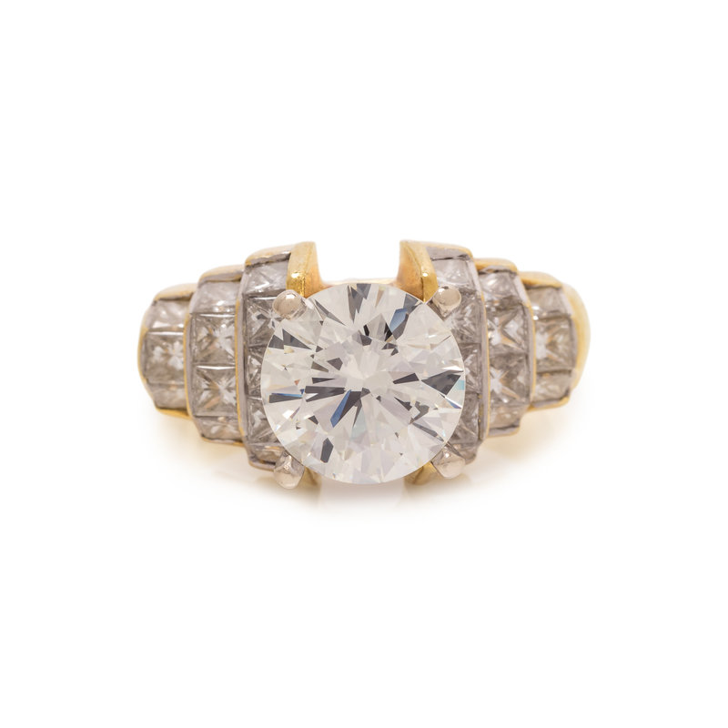 Containing one round brilliant cut diamond weighing 2.49 carats and 24 princess cut diamonds weighing approximately 2.15 carats total. Mounted in yellow gold. Ring size 2 1/4.