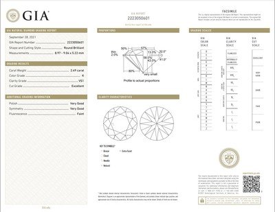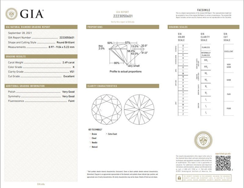 GIA, 2021, Report No. 2223050601, 2.49 carats, K color, VS1 clarity, Faint fluorescence