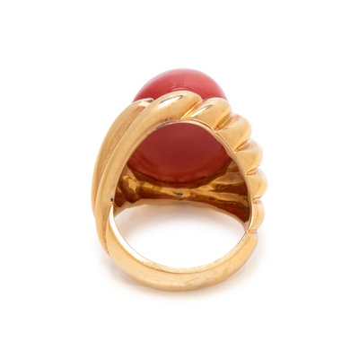 Containing one oval cabochon coral measuring approximately 19.35 x 14.35 x 10.30 mm. Ring size 6.