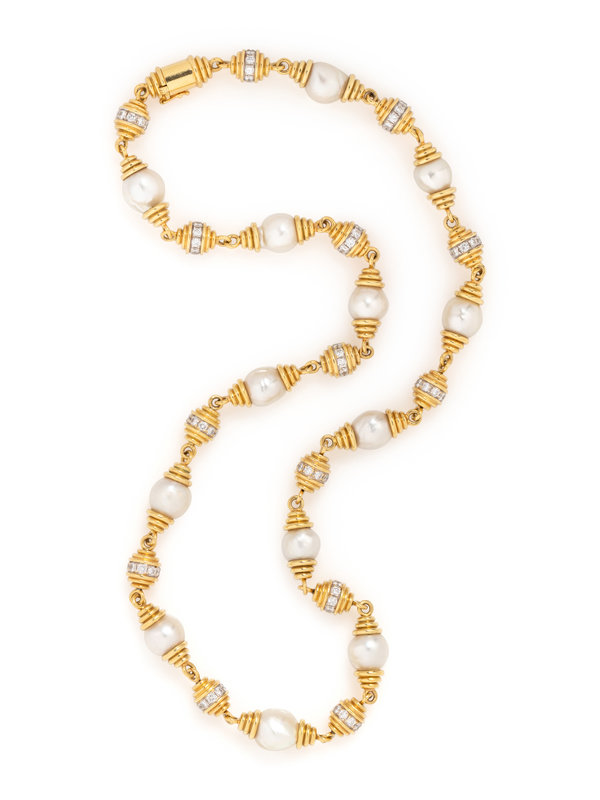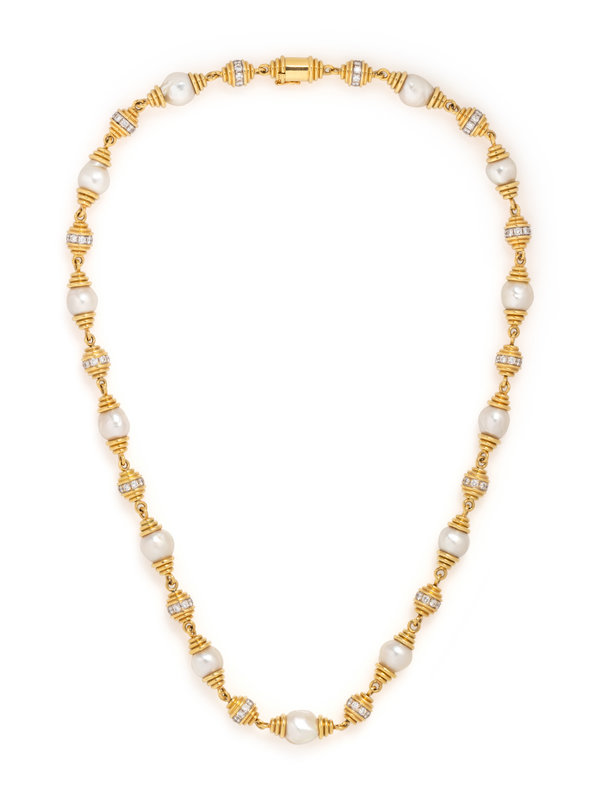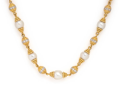 Consisting of yellow gold links containing 13 Baroque pearls measuring approximately 11.00-13.30 mm wide and 126 round brilliant cut diamonds weighing approximately 7.55 carats total. 26 inches long.