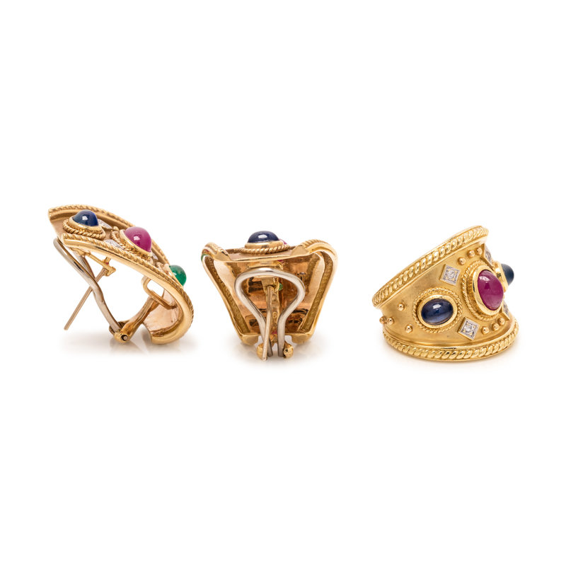 Consisting of a pair of earclips containing two oval cabochon sapphires, two oval cabochon rubies, two oval cabochon emeralds and eight round brilliant cut diamonds, posts with clip backs, together with a ring containing one oval cabochon ruby, two oval cabochon sapphires and four round brilliant cut diamonds. Earclips: 1 1/16 inches long. Ring size 7 1/4.