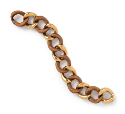 Consisting of alternating yellow gold and wood curb links. 8 inches long.