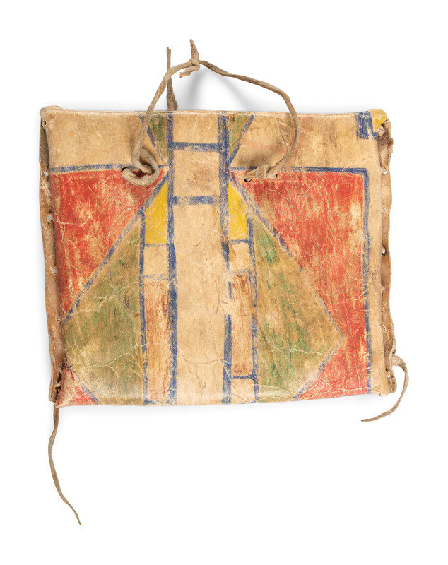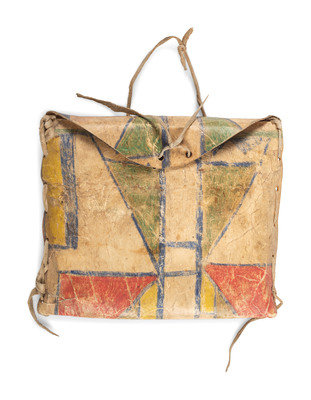 possibly recycled from a larger parfleche; envelope laced with hide thongs