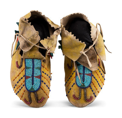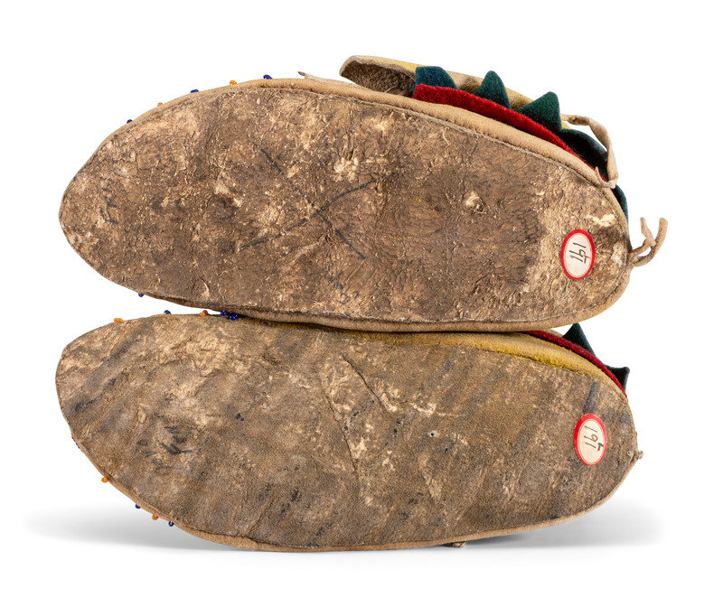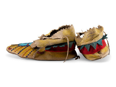 thread and sinew-sewn on soft hide, coated in yellow pigment; pinked cuff edges accented with green and red trade wool; beaded linear design on vamps in colors of navy blue, sky blue, red white-heart, faceted silver, and greasy orange