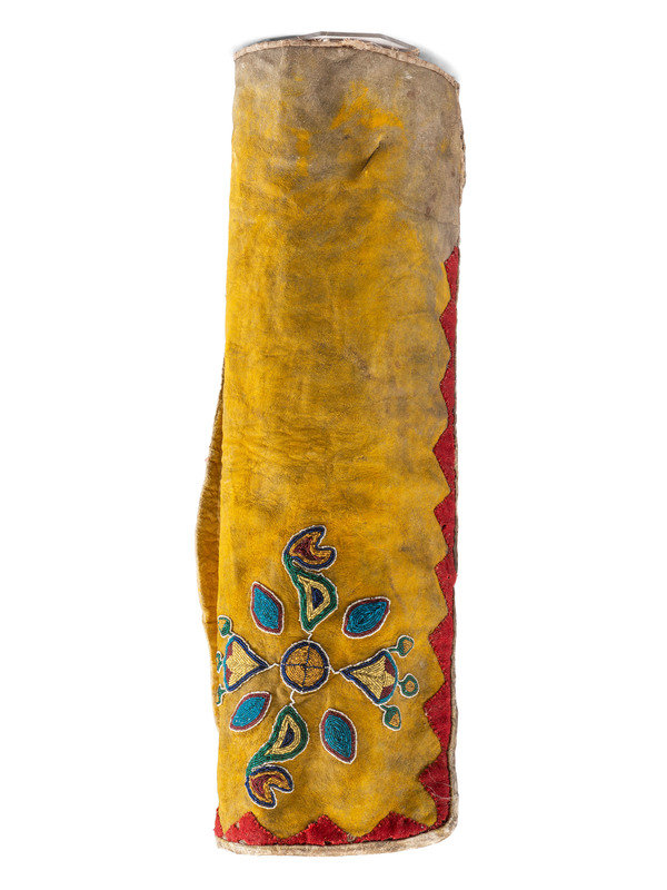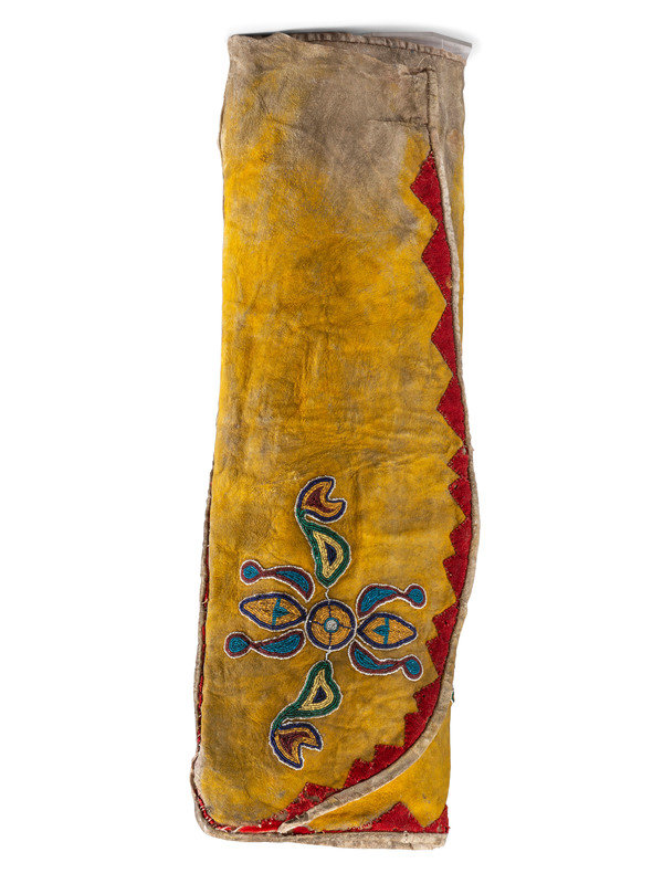 thread and sinew-sewn; with organic design beaded using small, faceted beads in colors of pony trader blue, rose, greasy yellow, translucent green, rose, and white; hide coated in yellow pigment; old red trade cloth detailing; interior lined with linen