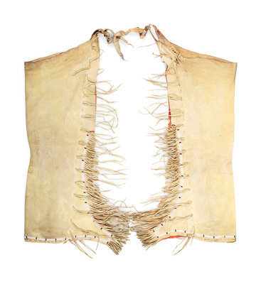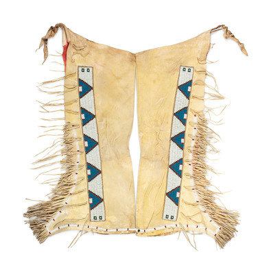 sinew-sewn and beaded on softly tanned hide with remnants of yellow and red pigment; beaded using colors of white, blue, red, and forest green