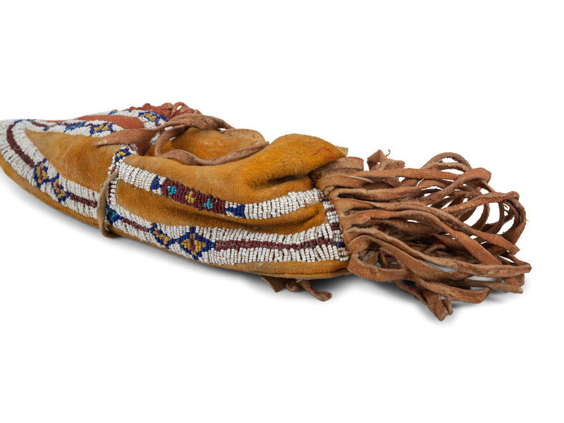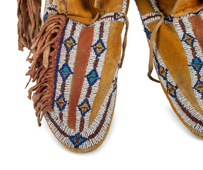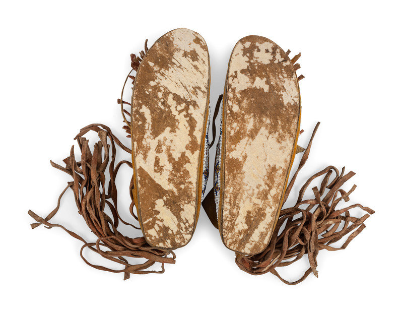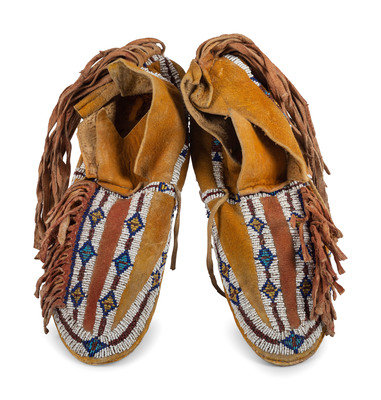 sinew-sewn on hide coated with yellow and red pigment; beaded using colors of white, red white-heart, greasy yellow, robin's egg blue, and royal blue; having long fringe attached at the heel and constructed with plain parfleche soles