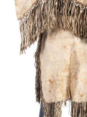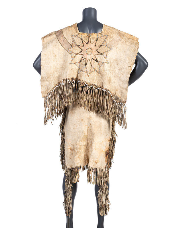 thread-sewn dress constructed in two parts using commercially tanned hide, skirt constructed in two panels