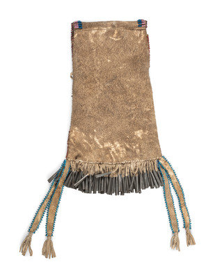 thread-sewn on softly tanned hide with tin cone fringe; beaded using colors of dark green, pink, red, shades of blue, and white