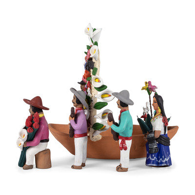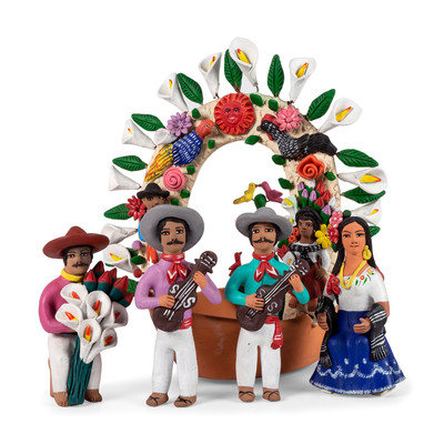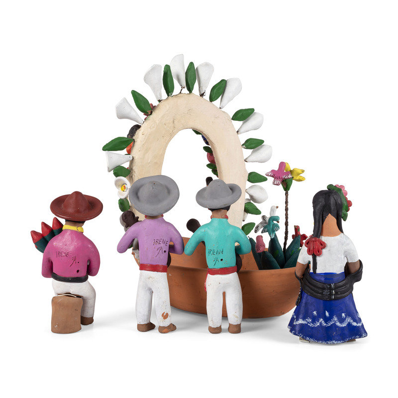 ceramic fruit basket decorated with flowers and birds carefully watching over a lover scene of a Man and woman being serenaded by two musicians playing the vihuela, signed Irene A