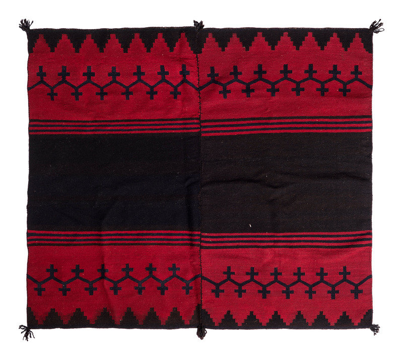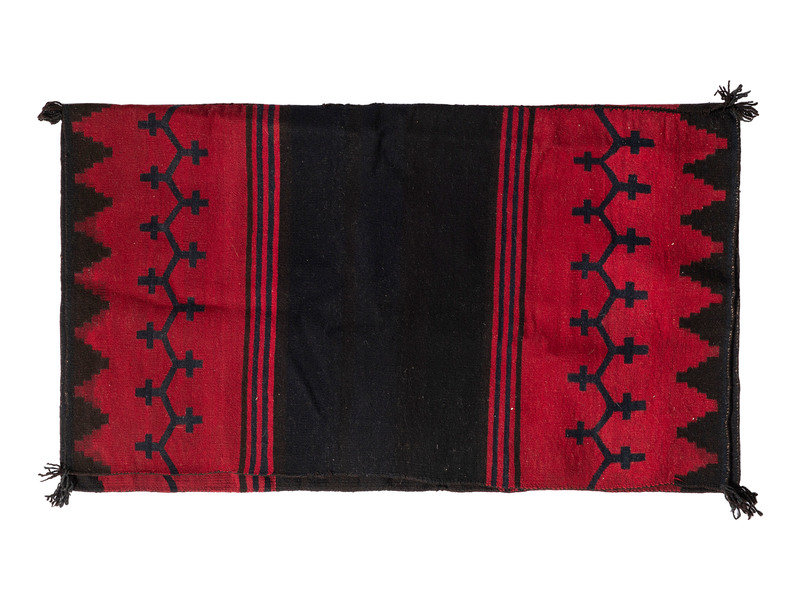 woven with hand-spun wool to create a zig-zag pattern with crosses along the borders in colors of blue, black, and red
