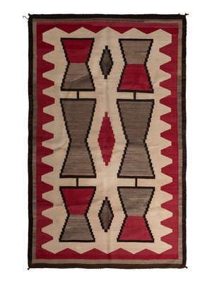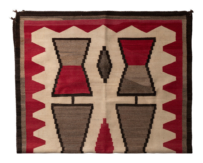 handspun wool; with a bold design of negative space filled with stepped hourglasses and cogged border