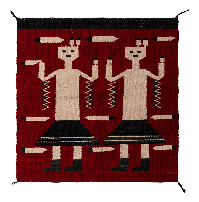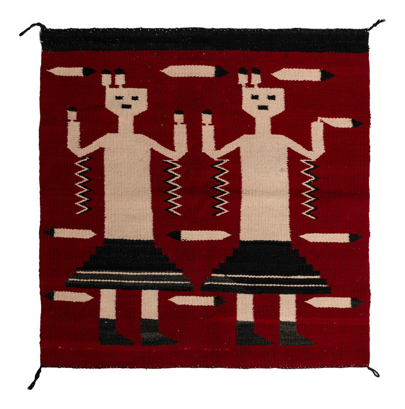 handspun wool woven with a red ground; designed with two figures, feathers, and lightning