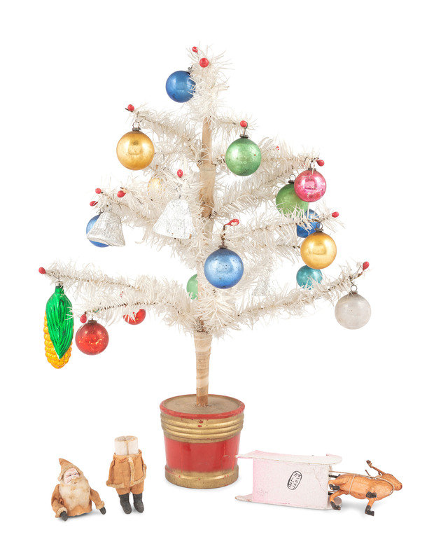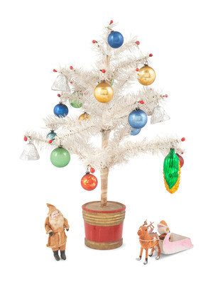 Two Miniature Composition Santa Claus Figures and a White Feather Tree with Ornaments
