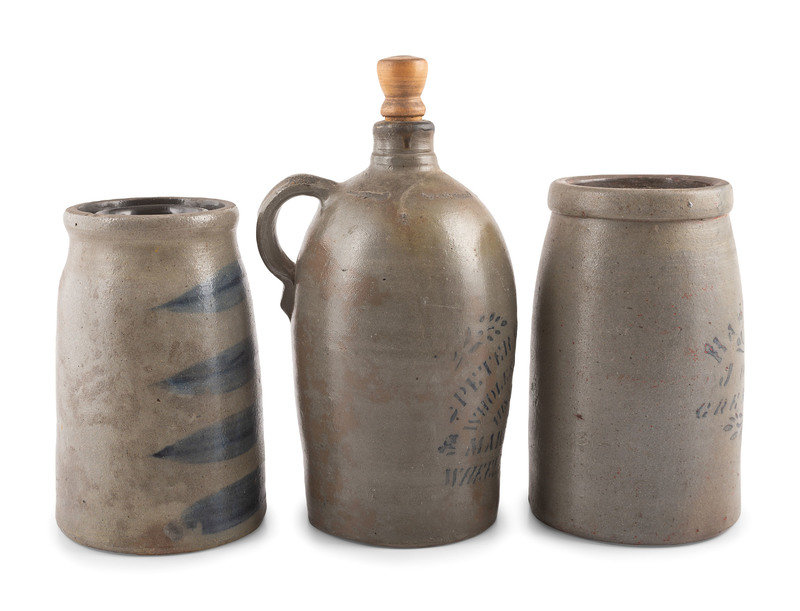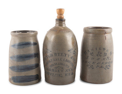 comprising a Peter Welty & Co. advertising jug, a Hamilton & Jones canner and a striped canner.