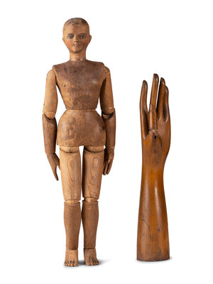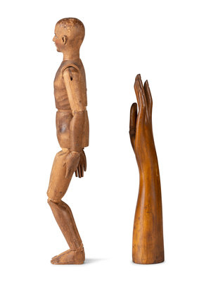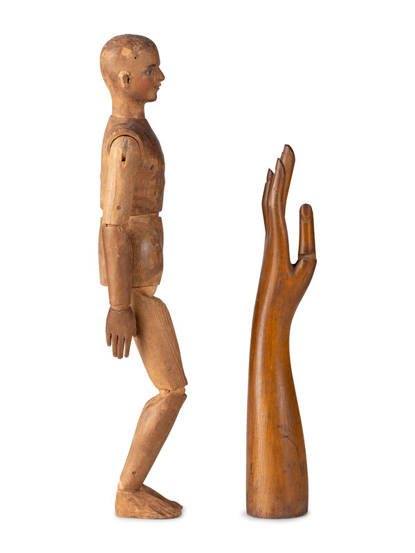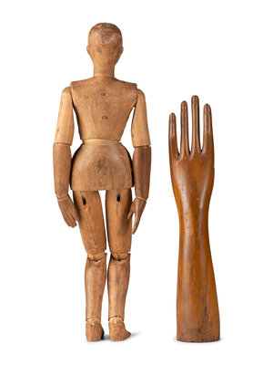 An Articulated Wooden Mannequin and a Carved Wooden Hand with Articulated Thumb