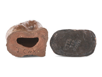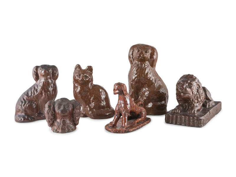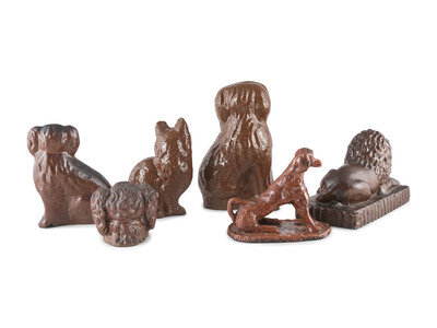 including a recumbent lion, a spaniel signed J. Cox, a paperweight and a cat, along with a redware dog signed ETTA / TCP /2/23/93, and a ceramic seated dog.