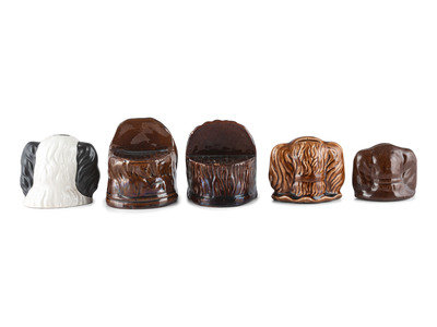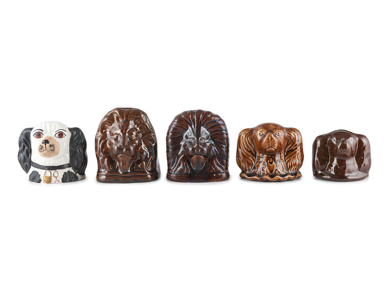 including four in Rockingham glaze and one painted Staffordshire bank.