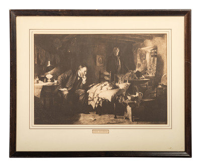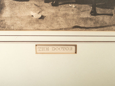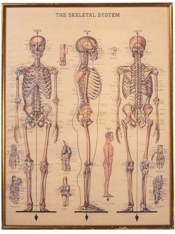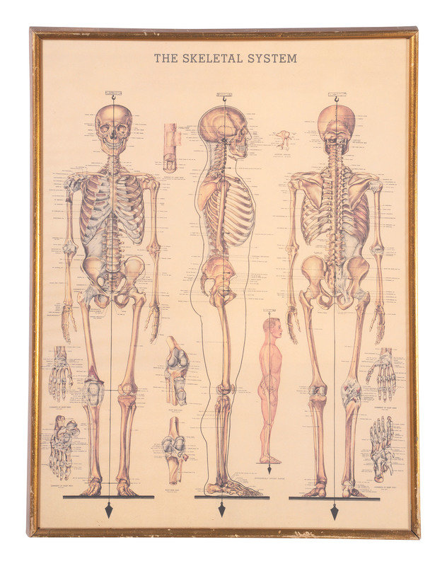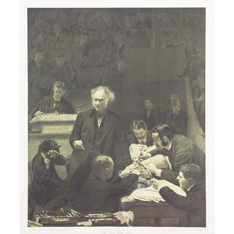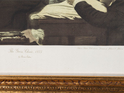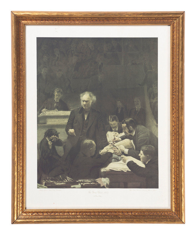 including a skeletal system print, The Gross Clinic by Eakins for Ethicon Suture Laboratories, and a print titled The Doctor.