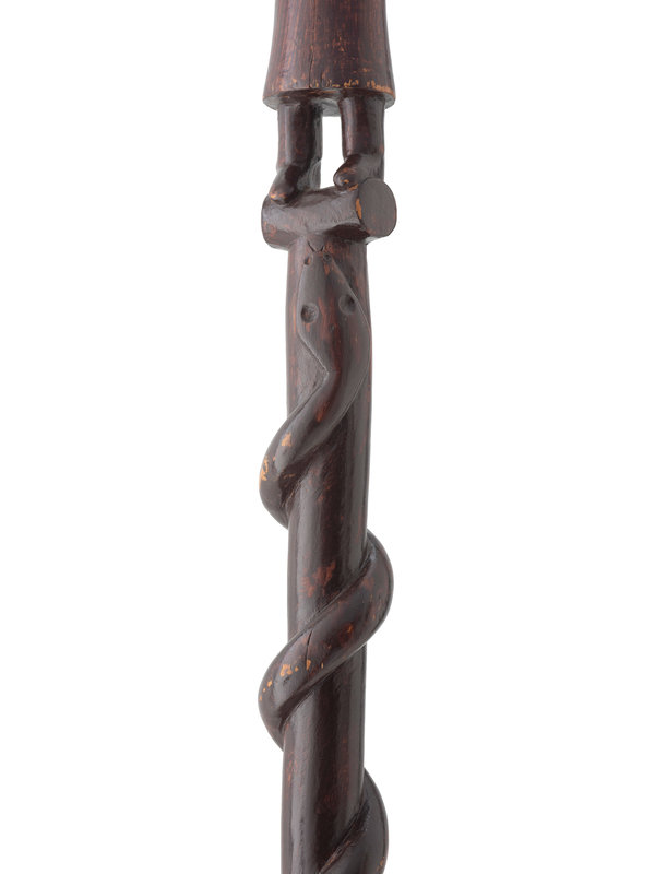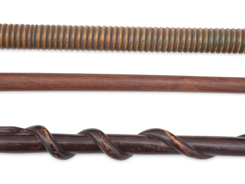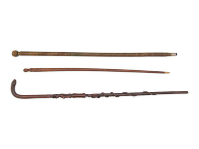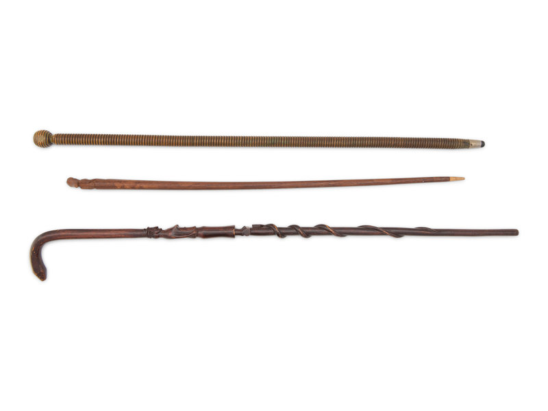including one figural snake cane, one cane with figural handle and one turned cane with light green patina and metal ferule.