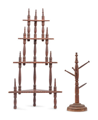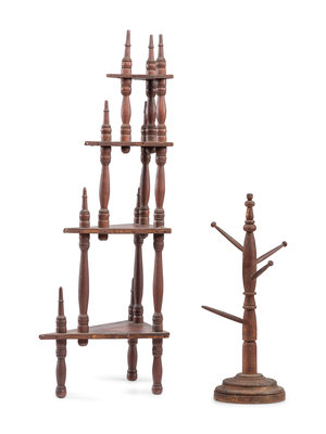 A Diminutive Tiered Paint Decorated Shelf and a Post-Form Standing Wooden Rack